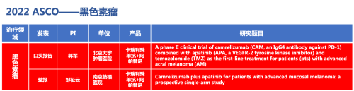 黑色素瘤领域的2篇研究摘要,采用PA视讯医药自主研发的PD-1抑制剂卡瑞利珠单抗(艾瑞卡)联合阿帕替尼(艾坦)(“双艾”组合)的免疫联合抗血管(或再联合化疗)的治疗策略。